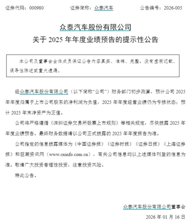 根据1月17日晚间披露的2025年度业绩预告,众泰汽车预计当年归属净利润为负值,经营业绩仍为亏损状态,年末净资产为正值。此前三季报显示,公司期末归属于上市公司股东的所有者权益仅1258万元,资产负债率达99.41%。
