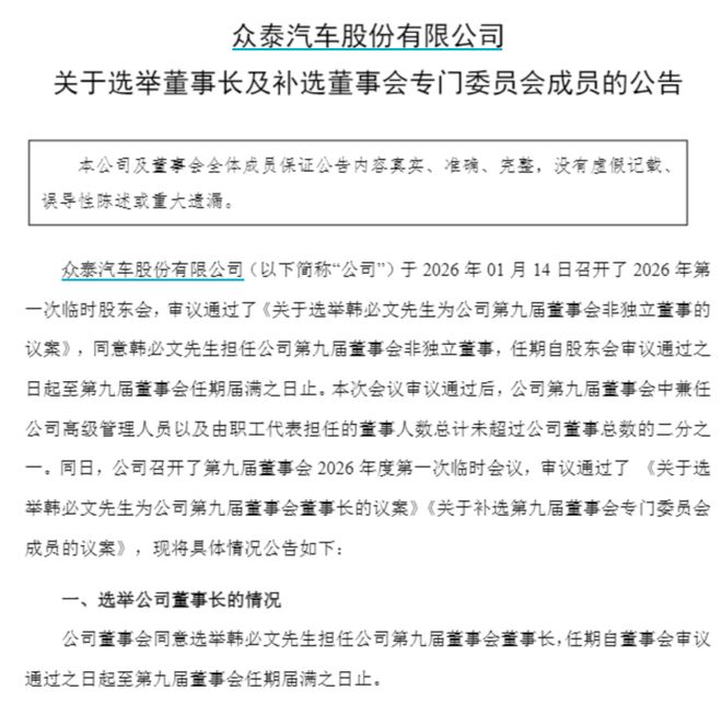 2026年1月15日,公司董事会选举韩必文为第九届董事会董事长。1978年出生的韩必文此前有20多年职业生涯在奇瑞度过,2025年11月28日被聘为众泰汽车的总裁。