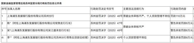 另外这并非浦发银行2026年以来的首张大额罚单。如上图,早在1月5日,浦发银行苏州分行就因票据审核不严、个人贷款管理不到位,被罚款110万元。
