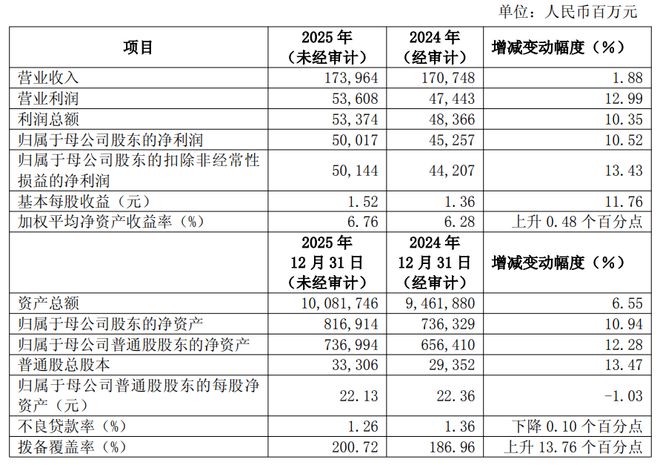 不过话说回来,衡量银行的关键不是规模,而是赚钱效率。浦发银行的业绩预告数据显示,其2025年净资产收益率(ROE)为6.76%,虽然比2024年的6.28%有所提升,但在上市银行中仍处于偏低水平。
