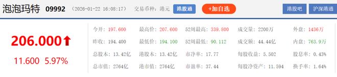 市场的反应比预期更为热烈。泡泡玛特股价当日午后应声而起,盘中涨幅一度超过6%,最终收涨5.97%。