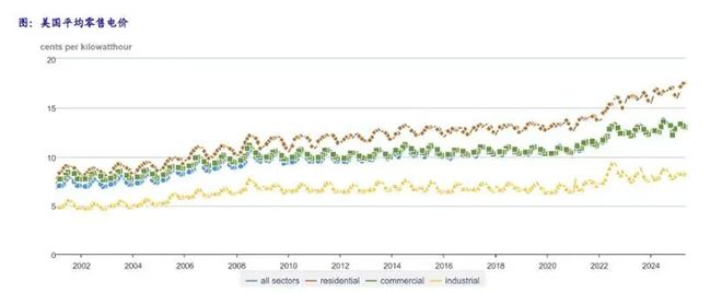 最后的结果就是,在美国由于缺电涨电价的背景下,国内25年的电价实际上是在跌的。