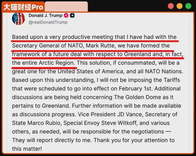 他说,他和北约秘书长马克·吕特就格陵兰岛和北极的未来协议,达成的框架,基于此,2月1日要给欧洲八国加的10%关税,就此取消。