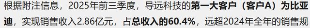 据招股书显示,2025年前三季度,导远科技对最大客户比亚迪的销售收入占比已飙升至60.4%,前五大客户占比合计高达88.8%。这种空前的客户集中度,使得导远科技的命运与比亚迪的采购策略、经营状况深度捆绑,丧失了基本的商业自主性与风险分散能力。