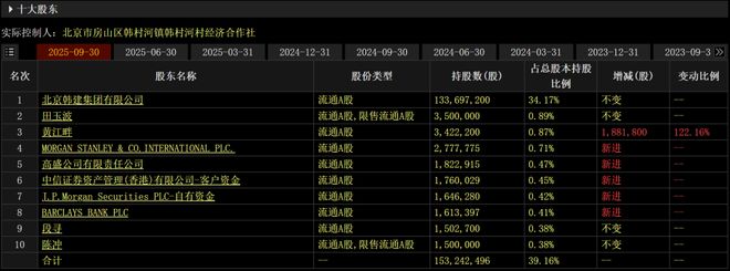 时代周报记者注意到,多家外资机构已提前“埋伏”,2025年第三季度,大摩、高盛、小摩、巴克莱、瑞银集团新进成为韩建河山前十大流通股东。