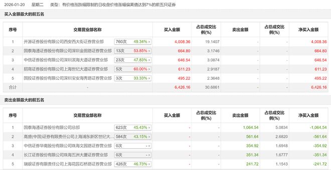 韩建河山1月20日盘后龙虎榜显示,量化基金分别占据了买一、买三、卖一、卖二、卖五席位。其中,处于买一的量化打板常用席位开源证券股份有限公司西安西大街证券营业部当日买入4008.36万元,金额超过了买二至买五之和。