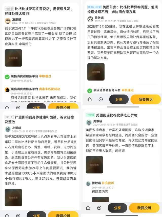 2024年8月,有顾客投诉在比格比萨吃到异物。2025年2月23日晚,也有顾客表示,在北京海淀上地华联店用餐后,出现恶心、呕吐、发热等症状,就医诊断为急性胃炎细菌感染及反流性食管炎。该用户因身体不适错过次日面试,提出2455元赔偿诉求,包含赔偿金、机票及医疗费,并要求整改店内卫生。