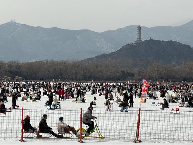 “抬眼是佛香阁,脚下是昆明湖冰面,这就是北京冬天的专属浪漫。”在颐和园冰场入口,游客正排队等候,“冬日限定体验”拉动了市场消费热度;凛冽的寒风也吹不散游客对这份独特体验的期待。这片被誉为“皇家冰场”的游乐场所,凭借古建与冰面相映的独特景致,成为京城冰雪打卡的热门之选。