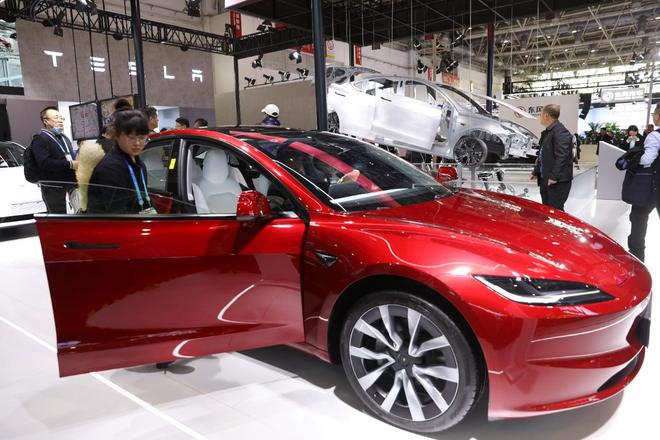 图为北京一展会上展出的特斯拉Model 3焕新版汽车。(图片由CNSPHOTO提供)