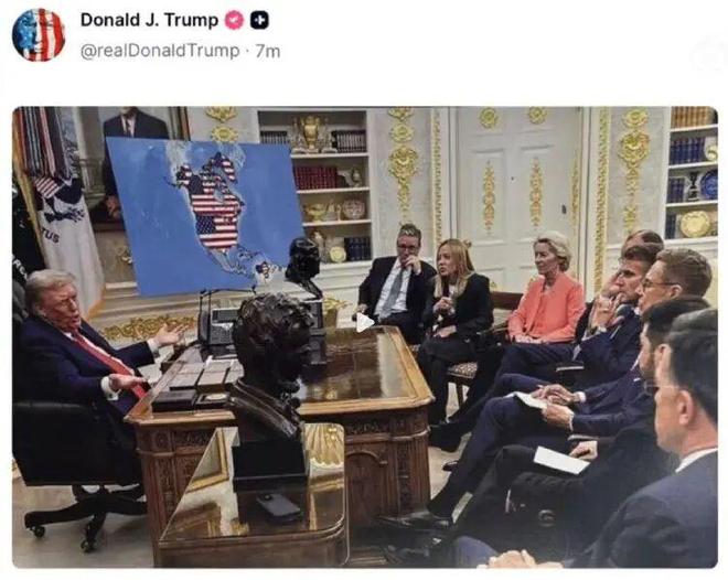 特朗普似乎根本不管妥不妥当。就在他发布“登格陵兰岛插星条旗”P图的当天,他还发布了另一张照片。照片的底板是其去年在白宫接待来访的欧洲领导人们。但他所展示的画板,情况有变。其中,除美国本土外,加拿大、格陵兰岛和委内瑞拉均被美国国旗覆盖。