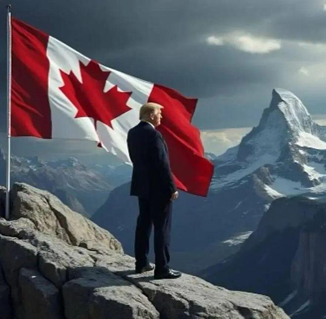 2024年末,当他再次成功当选美国总统不久,突然发了一张人工智能合成的北望群山之图,图中他自己站在加拿大国旗边。