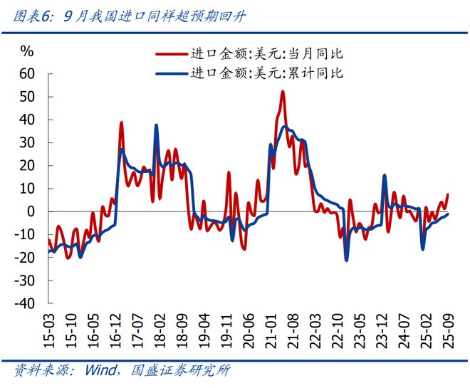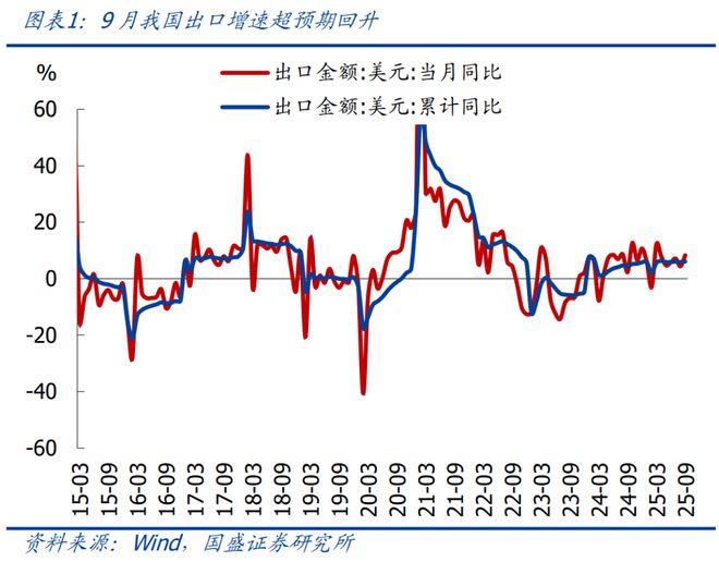 核心观点:9月出口增速再度回升、创近半年新高,剔除低基数后与4-8月接近,持续体现了我国出口的强韧性;9月出口高增带动三季度出口增速至6.5%、略高于一二季度,这将进一步支撑三季度GDP增速和全年“保5%”;需注意的是,9月进口同比大升至7.4%、创近一年半来新高,季度同比也从连续三个季度负增后首次转正。展望四季度出口,预计同比将有所回落、但大概率延续为正,指向4月关税以来我国出口整体偏强、年中市场普遍预期出口转负的情形应不会出现。继续提示:中美双方并未关闭谈判窗口,关税应难以实质性大幅加码,紧盯未来几周变化、以及10月底可能的中美最高层会晤。