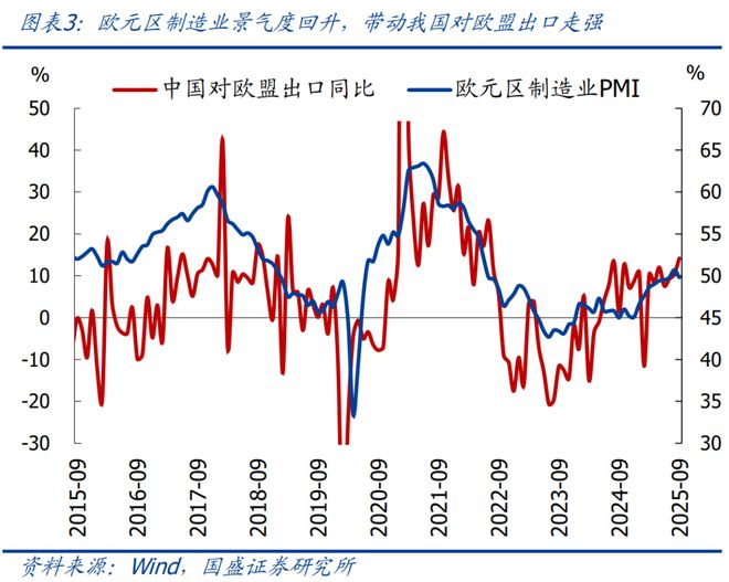 在美国关税冲击下,我国前三季度出口均保持在6%左右的中高增速,具体支撑有二:一是欧盟经济景气度提升,带动进口回暖。今年前三季度,欧元区制造业PMI中枢水平约为49.0%,高于2024年的45.9%,制造业复苏带动进口回暖,今年欧盟进口累计同比增5.3%(数据仅更新至7月),较2024年回升8.6个百分点;二是我国在非洲、中东等新兴市场中的份额提升。9月我国对非洲、中东出口仍偏强,主要受益于“一带一路”建设带来的份额提升,对非洲、中东出口增速远超当地进口增速。