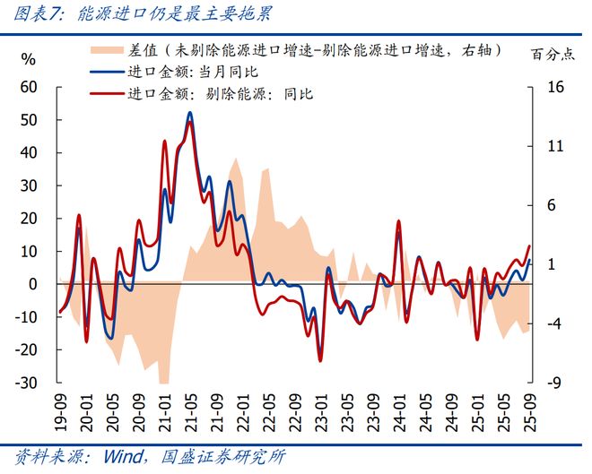 4、进口看,9月进口同样超预期回升;其中集成电路是最主要拉动,工业金属、飞机进口延续偏强;能源、汽车是拖累。具体看,9月我国进口同比增7.4%,创2024年5月以来新高,也高于Wind一致预期1.4%;Q3进口同比增4.3%,为连续三个季度负增后首次转正。结构上看:1)集成电路:9月进口增速进一步回升5.7个百分点至14.1%,拉动进口2.3个百分点;2)工业金属:9月铜矿、铁矿、铜材进口同比分别增24.4%、13.4%、8.3%,合计拉动进口1.4个百分点;3)飞机: 9月飞机进口增速大幅回升至201.3%,拉动进口0.6个百分点;4)能源:进口延续偏弱,主要受价格压制,原油、煤炭、天然气、成品油进口同比分别为-7.4%、-28.1%、-20.5%、-15.5%,合计拖累进口2.1个百分点,较8月拖累收窄1.2个百分点;5)汽车:9月进口同比-36.4%,拖累进口0.5个百分点。