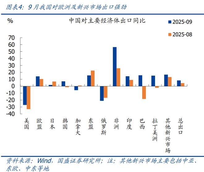 1)发达经济体,9月我国对美出口维持低位,同比降27.0%,降幅与上月接近,拖累出口4.2个百分点;9月我国对欧盟出口增速进一步回升3.8个百分点至14.2%,与基数回落有关,拉动出口2.0百分点。