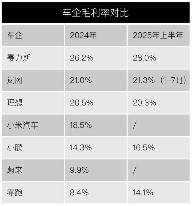 注:小米汽车、蔚来未披露2025上半年毛利率 「定焦One」制图