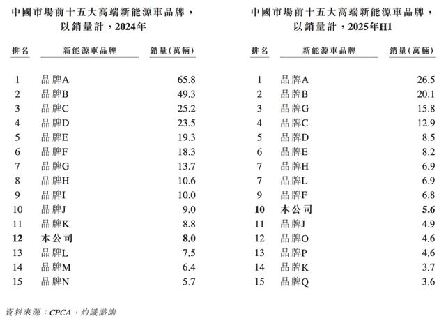 在中国高端品牌中,岚图2024年排名第12, 2025年上半年升至第10