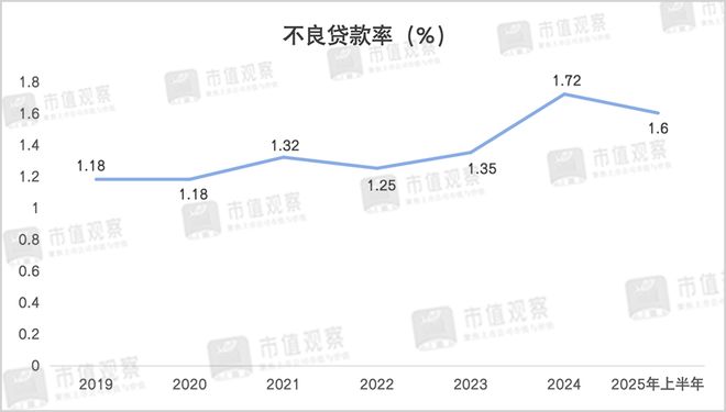 近年来,该行的不良贷款率总体呈现逐步抬升的趋势,2019年至2025年上半年由1.18%增长至1.6%,位居17家A股上市城商行第4位。