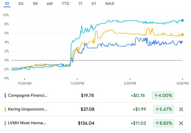 好于预期的财报后,路威酩轩集团ADR股价飙升超8%。而古驰所有者开云集团涨5.67%、爱马仕国际和卡地亚所有者历峰集团的ADR也上涨4%,因为路威酩轩集团通常被视为行业领头羊。