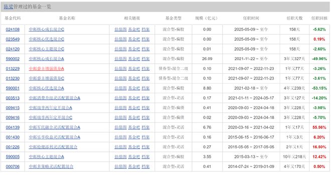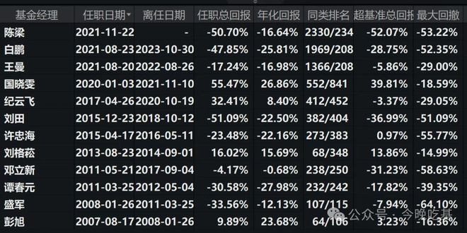 其中最引人注目的当属邓立新。作为任职时间最长的基金经理,曾任中邮基金投资总监的他,最终却因“老鼠仓”问题被调查。颇具讽刺意味的是,在其管理期间,该基金收取的管理费累计超过10亿元,留给投资者的却是长期亏损的巨大窟窿。