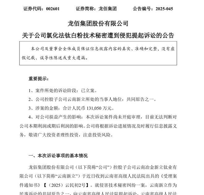 红星资本局10月14日消息,龙佰集团(002601.SZ)发布公告称,公司控股子公司云南新立钛业有限公司(以下简称“云南新立”)因技术秘密遭到侵犯,向云南省高级人民法院提起诉讼,成为共同原告之一。