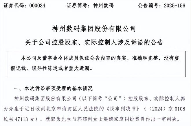 10月10日,神州数码公告披露,法院已于2025年9月30日就实控人郭为与郭郑俐离婚案件作出一审判决,准予双方解除婚姻关系。