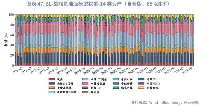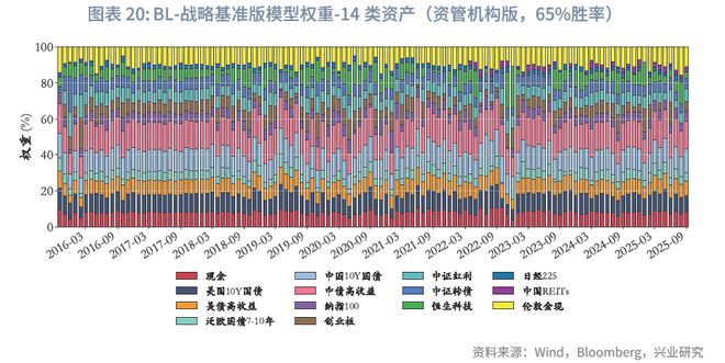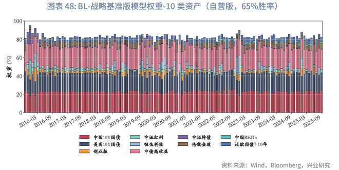 风险平价下的权重微调:与“BL-战略基准”模型不同,“BL-风险平价”模型未预设初始权重,而是由风险平价提供,且与“风险平价模型”中“纯风险等权”版本一致。在“BL-65%胜率-风险平价”下,在核心10类资产中,其整体平均权重之和约为84.6%,其中平均权重较高的几类资产依次为中债高收益、泛欧国债7-10年、中国10Y国债、美国10Y国债。固收类资产中,中债高收益、中国10Y国债、美债高收益、泛欧国债7-10年、美国10Y国债的平均权重分别为28.8%、17.2%、14.8%、10.3%、6.5%,整体固收资产权重总和为78%,与“风险平价-65%胜率”版本的86.4%存在差异,可能原因如下:(1)BL模型纳入主观观点采用贝叶斯思路,通过调整初始市场隐含均衡收益影响最优化求解,而风险平价模型则通过直接建立主观观点超额收益与波动率预期的映射进行调整,未纳入对观点不确定性的考量;(2)BL模型包含投资者风险厌恶系数、市场均衡信念等超参数,也会导致差异。两种模型纳入主观观点的方式难分绝对优劣,通常而言,风险平价的方式更主观直白,从主观观点到超额收益、波动率再到权重基本呈线性映射;而BL模型的兼容性则更强。