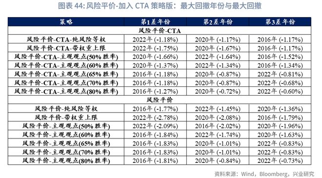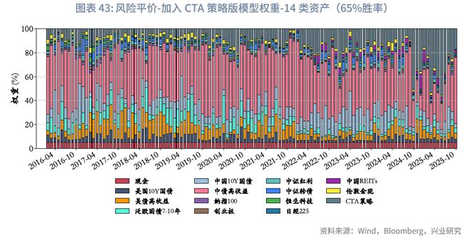 从相关性分析结果来看,CTA策略指数与多数资产呈负相关或低相关关系,其中与该指数相关性最高的资产为中国REITs,相关系数也仅为0.08。从组合表现来看,加入CTA策略后,组合波动显著降低,同时获得更高的夏普比率。与未加入CTA策略的基准组相比,在所有胜率场景下,加入CTA的风险平价模型波动率、最大回撤均有所下降,且夏普比率明显提升,这表明加入CTA策略在未显著牺牲收益的前提下,有效降低了组合波动。