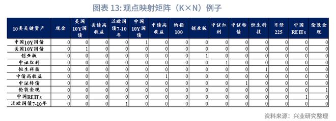观点映射矩阵P:从当前可投资资产中筛选关键资产,构建维度为K×N的观点映射矩阵P(K为关键资产数量,本文为10,N为全部可投资资产数量,本文为14)。矩阵中每一行对应一个观点的资产权重向量,仅在对应关键资产位置赋值1,其余位置为0,以此清晰标识观点所针对的具体资产。