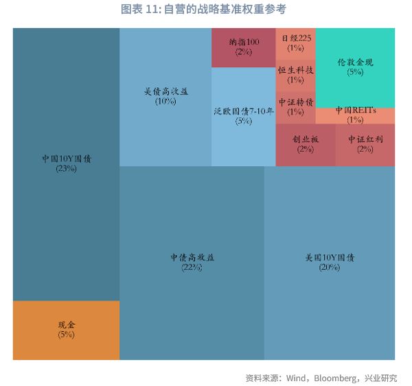 需注意的是,两类主体均以固收类资产作为配置底仓,具体结构与权重存在以下特征:对于资管机构,截至2025年9月底,股票型、混合型、债券型、货币市场基金占比分别为14.90%、9.22%、32.02%、40.28%,剩余为QDII、FOF基金等;若剔除货币基金,债券型基金在股票型、混合型、债券型基金中的占比达57%。而银行理财的固收资产比重更高。对于自营业务,固收类资产占比通常更大:上市券商自营的权益类资产占比平均约8%-15%,固收类占比则超过80%。商业银行自营中直接债券投资占比超80%,其余为基金、非标等;保险自营的债券投资占比约50%,股票、长期股权投资及基金占比约20%,剩余为银行存款等。上述背景下,本文设定两类主体的具体资产权重如下:自营的现金、固收、权益及类权益、商品权重占比分别为5%、80%、10%、5%;资管机构的对应权重则为8%、50%、32%、10%,各资产子类的具体权重可参见下图。