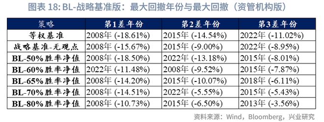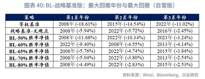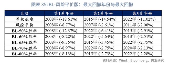 最大回撤年份分析:以65%胜率为例,与“BL-战略基准版”相比,“BL-风险平价版”的初始权重由风险平价机制计算得出,2008年日经225、纳指100、中证红利的权重基本在年底降至0,而2008年1月时,上述资产的权重总和为16.8%。相较于“BL-战略基准版”事先设定基准权重的模式,风险平价模型对资产波动的敏感性更高,因此在极端回撤场景下,其回撤控制能力也更为出色,尤其适合对风险与回撤要求极高的机构。此外,“BL-风险平价版”在其余年份的最大回撤,基本都控制在3%以内。
