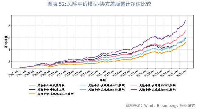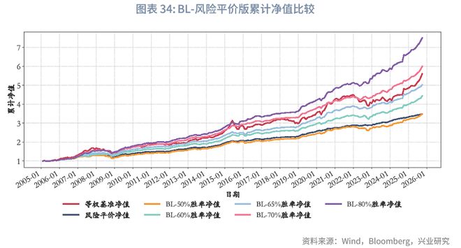 我们对“BL-风险平价”的多个版本展开对比,具体包括基准(各类资产等权重)、无观点版(风险平价权重)与生成主观观点版;其中主观观点的胜率水平仍设置为50%、60%、65%、70%,且观点生成方法与“BL-战略基准”完全一致,此处不再赘述。