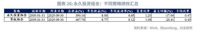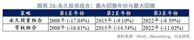 风险收益方面,样本期内,永久投资组合策略几乎严格优于等权策略。二者收益接近,永久投资组合年化收益8.00%,等权组合年化收益8.77%;但永久投资组合波动显著更小,年化波动率6.65%,等权组合为8.12%;回撤更低,最大回撤-17.04%,等权组合为-20.41%;且夏普比率更高,达1.20,等权组合为1.08。从最大回撤年份来看,得益于25%现金的配置缓冲,2008年永久投资组合回撤17.04%,低于等权组合的18.61%。总结来看,永久投资组合通过提高现金比重,有效减少了组合波动与回撤,且收益未出现明显下降。