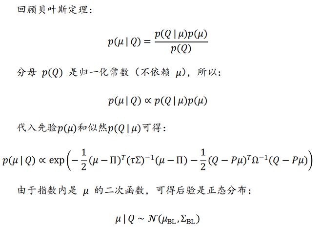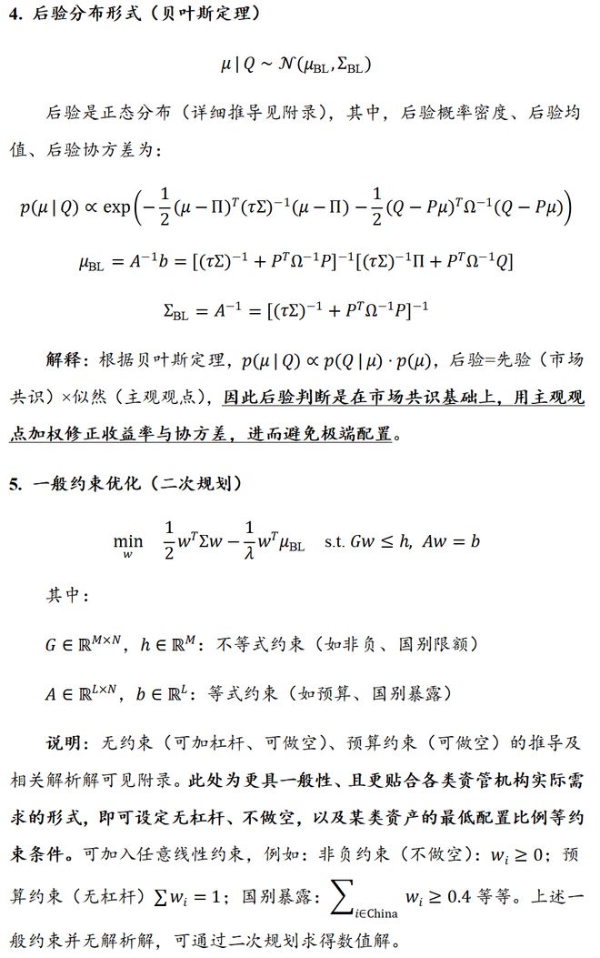 BL模型基于贝叶斯方法,核心是整合两类关键信息以优化预期收益输入:一是市场均衡收益(先验信息),无需投资者直接预测资产绝对收益,而是通过全球市场组合权重反推隐含的市场均衡收益率,作为市场共识的中性基准;二是投资者主观观点(最大似然),提供结构化框架允许投资者以绝对或相对形式表达对资产未来表现的前瞻性判断,并明确观点的信心水平。两类信息经贝叶斯整合后生成综合预期收益向量(后验收益),作为MVO模型输入进行组合优化,最终输出的权重通常更稳定、分散且契合投资直觉。
