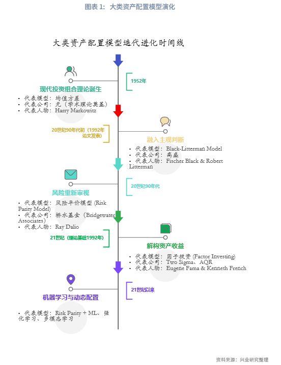 资产配置模型的演进可划分为四个阶段:以均值-方差(MVO)模型为代表的现代投资组合理论;以Black-Litterman(BL)模型为核心的主观观点融合阶段;以风险平价(Risk Parity)为标志的风险再平衡阶段;以及以因子投资为主导的收益解构阶段。