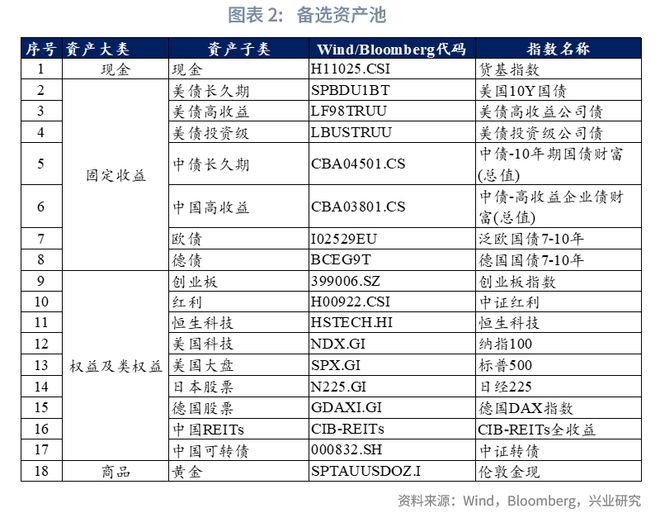 基于上述原则,最终初步选定18个子类资产,具体包括:(1)现金类:货基指数;(2)固定收益类:涵盖美债长久期、美债高收益、美债投资级、中债长久期、中国高收益、欧债、德债;(3)权益及类权益类:包含创业板、红利、恒生科技、美国科技、美国大盘、日本股票、德国股票、中国REITs、中国可转债;(4)商品:黄金。