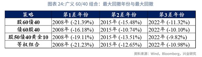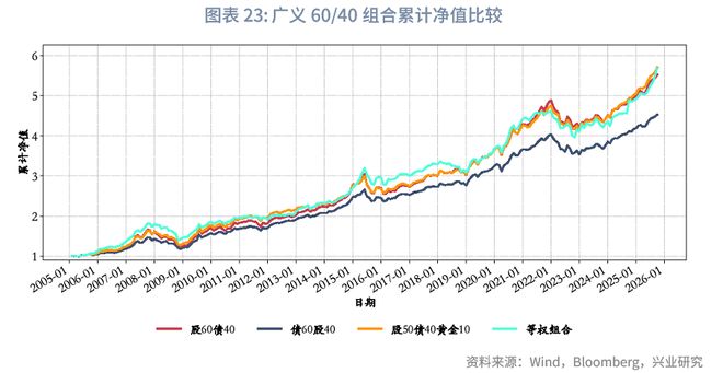 为了考虑流动性,我们设计了三个版本的广义60/40组合模型:(1)股60债40:固定现金仓位5%,95%可配置资产中股票占比60%、债券占比40%;(2)债60股40:固定现金仓位5%,95%可配置资产中债券占比60%、股票占比40%;(3)股50债40黄金10:固定现金仓位5%,95%可配置资产中股票占比50%、债券占比40%、黄金占比10%。