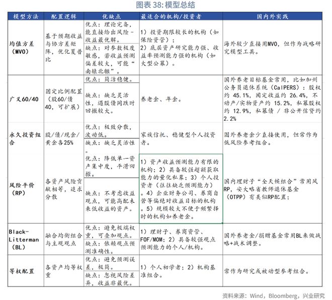 近年来受到广泛关注的风险平价,通过让各类资产在组合中贡献相等风险,实现风险来源的均衡化。其优点在于能够显著降低单一资产对组合的冲击,提高夏普比率,并在历史上展现出稳健的回撤控制能力。然而,该方法存在两方面局限:一是依赖杠杆提升收益,对衍生品与利率工具的使用要求较高;二是未显式纳入收益率预期,如果某一时期某类资产的预期收益偏低,风险平价仍可能给予其较高权重,从而导致潜在的机会成本。基于这些特点,风险平价更适合:1)追求稳健的养老金、银行理财子公司;2)具备较强单一资产超额获取能力的量化私募;3)缺乏预测能力的个人投资者;4)资金体量庞大、不支持高频择时的机构(如社保基金、养老金)。在国际实践中,美国俄亥俄州公务员退休系统(OPERS)和德州教师退休系统(TRS)均设有风险平价组合,富达投资(Fidelity)还专门推出了Risk Parity Fund。在中国,风险平价理念已逐步被理财子公司采纳,并常见于“全天候组合”的设计中。