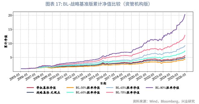 基准模型采用各类资产等权重配置。我们对比了“BL-战略基准版”的多个版本:无观点版(此处即战略基准配置)、生成主观观点版。其中,生成主观观点版的设置背景为:本研究仍以大类资产配置框架为核心,考虑到大类资产的主观观点获取难度较大,且即便可回溯,其样本期也相对较短,同时难以明确单个资产主观观点准确率达到何种水平时会产生显著超额收益。为此,我们设置了多个胜率水平:50%、60%、65%、70%、80%。