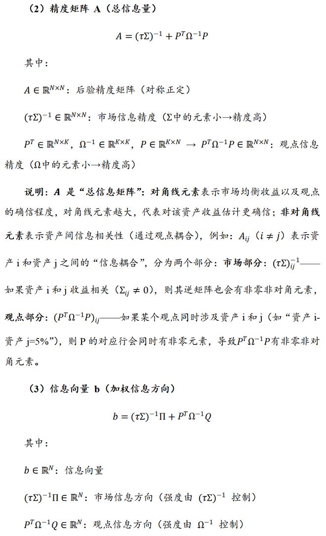 观点不确定性矩阵Ω:基于历史月度收益率数据计算各关键资产的波动率,构建对角协方差矩阵Ω。矩阵对角元素为对应资产收益率的方差,直观反映观点所依赖历史信息的不确定性——资产历史波动率越高,对应观点的不确定性越大(即可信度越低)。