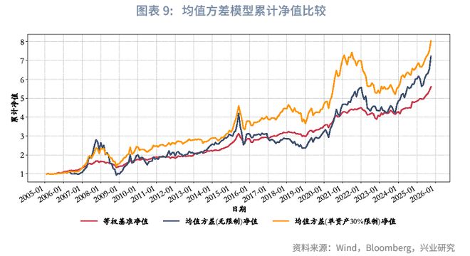 本文采用滚动4年的历史数据计算资产的预期收益率与协方差矩阵,而对大多数资产而言,4年时长已足以形成一个小周期。我们设计了两个版本的均值方差模型:(1)均值方差-无仓位限制版本(作为基准版本):不设置单个资产的仓位上限;(2)均值方差-单资产30%限制版本:在无仓位限制版本的基础上,增设单个资产30%的权重上限。同时,将等权配置模型作为参照模型,用于与上述两个均值方差模型版本进行对比分析。