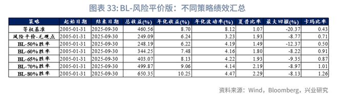 “BL-风险平价”与“BL-战略基准”的核心差异聚焦于风险与收益特征的侧重不同:前者更注重波动率与回撤的精细化控制,因而能实现更高的夏普比率,但长期年化收益会低于后者。例如,风险平价(无观点)[1]模型在样本期内可实现1.93的夏普比率,该数值略高于BL-战略基准-资管-65%胜率模型;同时,其年化波动率仅为3.23%,低于之前的所有模型,最大回撤8.77%也小于等权基准及BL-战略基准-资管(无观点)模型,而其6.24%的年化收益,则低于等权基准(8.70%)与BL-战略基准-资管(无观点)(8.10%)。进一步从两者对比可见,面对不同基础模型时,BL模型能有效融入主观观点,其更核心的价值在于作为“主观观点嵌入框架”的灵活性——能够与风险平价、战略基准等不同基础模型或各类配置需求相结合,而非局限于单一的风险或收益目标。