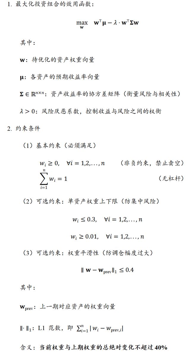 平滑性约束:通过引入战略基准权重,约束新权重与旧权重之间的L1范数变化不超过40%,从而有效控制换手率与交易成本。