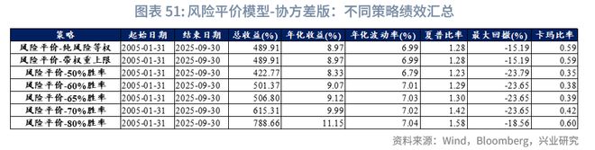 风险收益方面,样本期内,因组合权重整体偏向固收类资产,风险平价模型整体呈现较高夏普比率。其中,纯风险等权策略年化收益为6.35%,年化波动率控制在3.28%的较低水平,夏普比率达1.93;与组合内单个资产相比,该策略年化收益与美债高收益相当(详见附录“大类资产年化收益率和波动率”),且波动率低2个百分点,夏普比率高0.7。进一步来看,通过引入主观观点对策略进行优化后,其收益能力显著提升,当主观观点胜率达到60%时,策略表现实现关键性跃升:在保持与纯风险等权基准相近的年化波动率(3.37%)的同时,将年化收益大幅提升至7.94%。这一优化使策略夏普比率达到2.36,明显高于纯风险等权策略的1.93。
