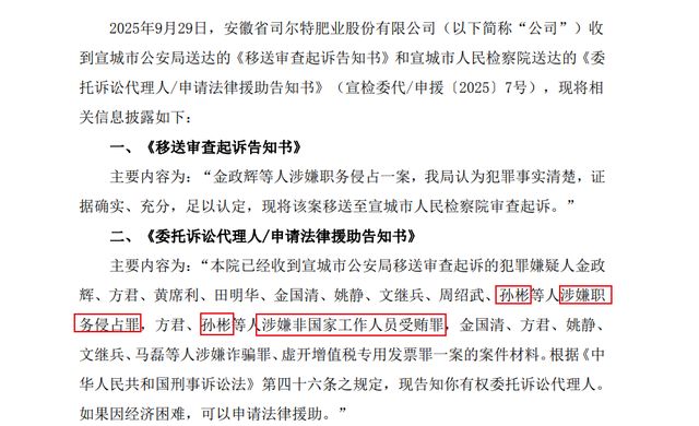 司尔特近日公告称,分别收到来自宣城市公安局及宣城市人民检察院送达的2封告知书。此次被移送审查起诉的涉案人员总计10位,包括公司前任董事、高管等,还有部分公司员工和证券服务中介机构工作人员;涉及的罪名包括职务侵占罪、非国家工作人员受贿罪、诈骗罪、虚开增值税专用发票罪。