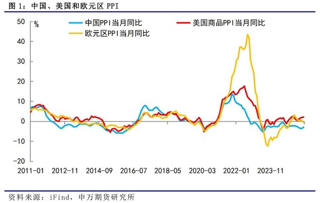 疫情后政策导向的不同以及经济结构的不同,导致中国、美国和欧洲需求端分化明显,对PPI造成深刻影响。(1)中国:新动能引领经济复苏。2021年以来,房地产进入调整周期,房地产上下游需求均受到拖累,压制相关产品的出厂价格。随着新质生产力的不断培育壮大,新动能逐步引领经济开始非均衡复苏,对PPI形成一定支撑。未来“反内卷”政策和扩内需政策将协同发力,带动大宗商品相关行业价格持续改善,PPI将逐步向合理区间回归。(2)美国:需求韧性较强。疫情期间,美国实施了大规模的财政刺激政策和宽松的货币政策,带来强劲需求,推动PPI显著上涨。此外,疫情后美国劳动力成本的上升增加了企业生产成本,在PPI中也会有所体现。为了遏制高通胀,2022年3月美联储开始实施加息,但由于经济韧性较强,PPI温和降温。(3)欧洲:需求温和复苏。2022年欧洲天然气和电力价格飙升,带动PPI显著上涨,为了应对通胀,欧央行大幅加息,同时外需也开始下滑,受需求疲软的影响,PPI持续回落。2024年以来,欧洲经济复苏带动需求回升,PPI开始修复。