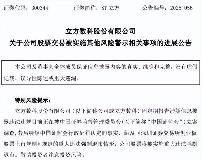2025年10月10日,ST立方发布《关于公司股票交易被实施其他风险警示相关事项的进展公告》。公告称:因公司目前被中国证监会立案调查,若后续公司触及重大违法强制退市情形,其股票将被强制退市,请投资者注意投资风险。
