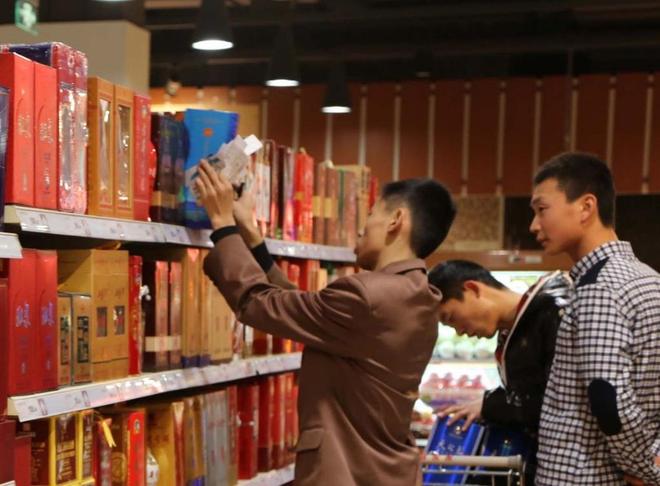图为河南许昌一家超市内,消费者正在选购白酒。(资料图,图片由CNSPHOTO提供)