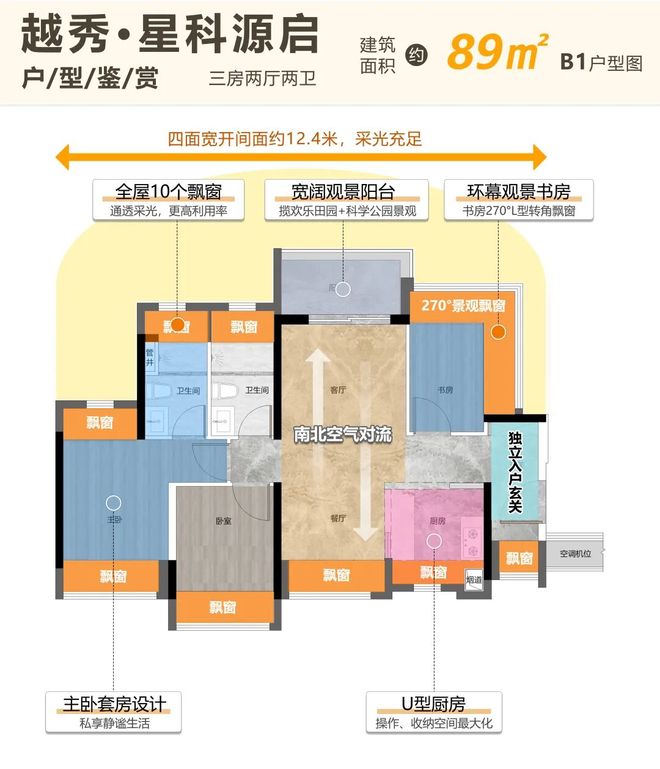 而星科源启建面约89㎡的B1和B2户型,竟做到了极为罕见的“双龙抱珠”式南北通透。