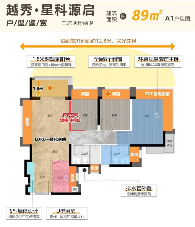 但在星科源启建面约89㎡的A1户型,设计师却通过更高成本的结构优化,做出了“270°无承重柱”的L型环幕飘窗。没有了碍事的墙角,窗外的风景就如同一幅真正的IMAX画卷,无缝融入你的视野。